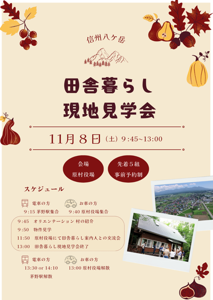 11月8日(土)に、田舎暮らし現地見学会を開催します。田舎暮らし案内人との交流会(座談会)も行いますので、移住をお考えの方は、ぜひご参加ください。
