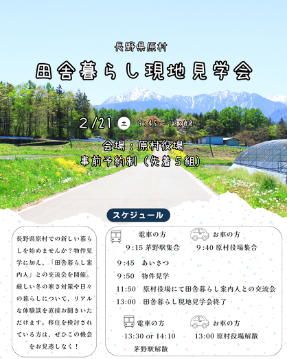 2月21日(土)に、田舎暮らし現地見学会を開催します。田舎暮らし案内人との交流会(座談会)も行いますので、移住をお考えの方は、ぜひご参加ください。