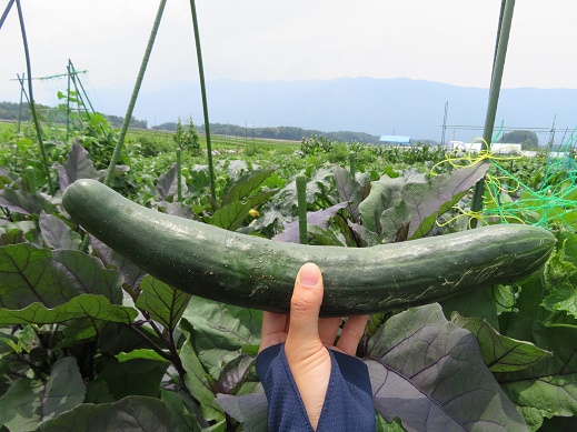 葉っぱに隠れていたようで収穫時を逃したキュウリ。こんなにでっかくなっちゃった!!もう隠れきれなくなり、道に飛び出していていました。これは漬物にします。