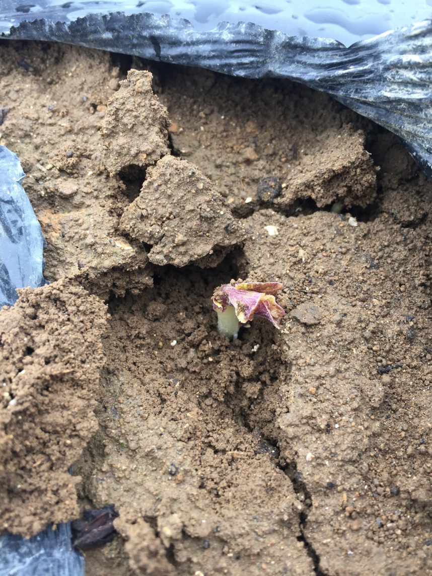 土の表面がひび割れているなぁと思って覗くと、小さな芽がそっと顔を出していました!